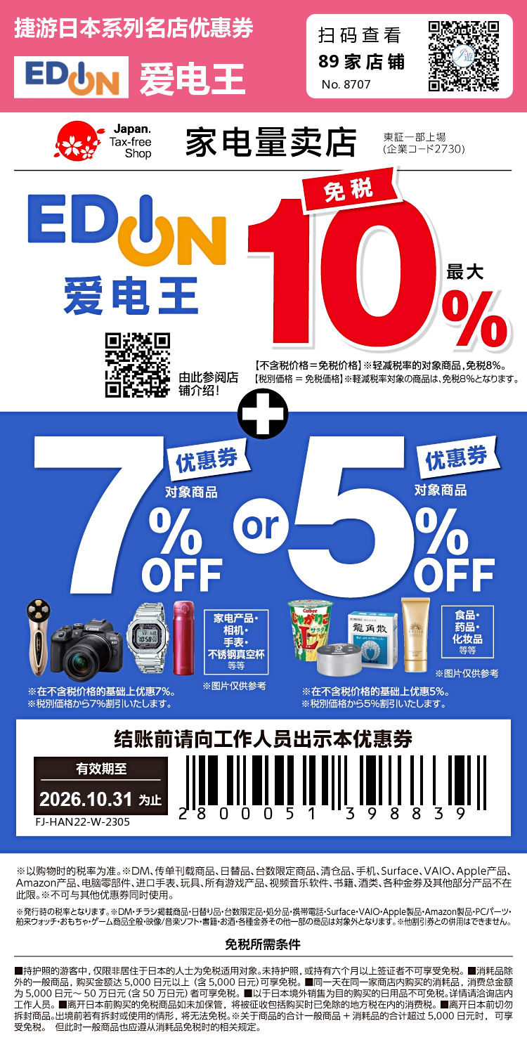 持护照的游名中,仅限非居住于日本的人士为免稅适用对象。未持护照,或持有六个月以上益证者不可享受免稅。口消耗品除外的一般商品,购买金额达 5,000 日元以上(含 5,000 日元)可享免税。口同一天在同一家商店内购买的消耗品,消费总金额为5,000 日元~50 万日元 (含 50万日元)者可享免税。巨以于日本境外销售为目的购买的日用品不可免税。详情请洽询店庆工作人员。口离开日本前购买的免税商品如末加保管,将被征收包括购买时己免除的地方税在内的消费税。口离开日本前切勿拆封商品。出境前若有拆封或使用的情形,将无法免税。必关于商品的合计一般商品 + 消耗品的合计超过 5,000 日元时,可亨受免税。但此时一般商品也应遵从消耗品免税时的相关规定