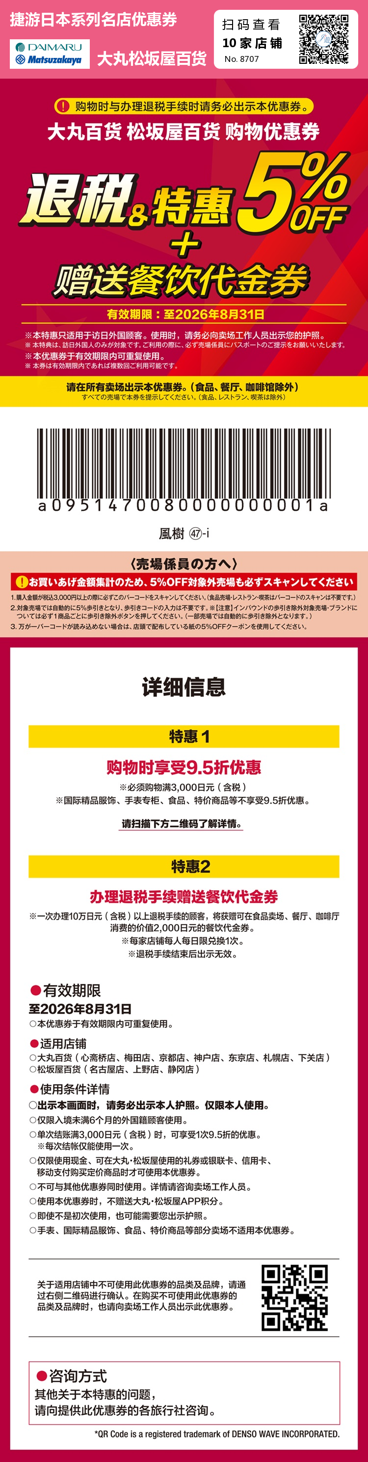 详细信息 特惠1 购物时享受9.5折优惠 然必须购物满3.000日元(含税) 泳国际精品服饰、手表专柜、食品、特价商品等不享受9.5折优惠。 请扫描下方二维码了解详情。 特惠2 办理退税手续赠送餐饮代金券 兴一次办理10万日元 (含税)以上退税手续的顾客,将获赠可在食品卖场、餐厅、咖啡厅消费的价值2,000日元的餐饮代金券。 *每家店铺每人每日限兑换1次。 洛退税手续结束后出示无效。
